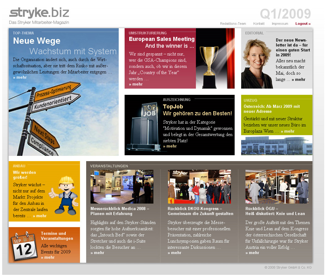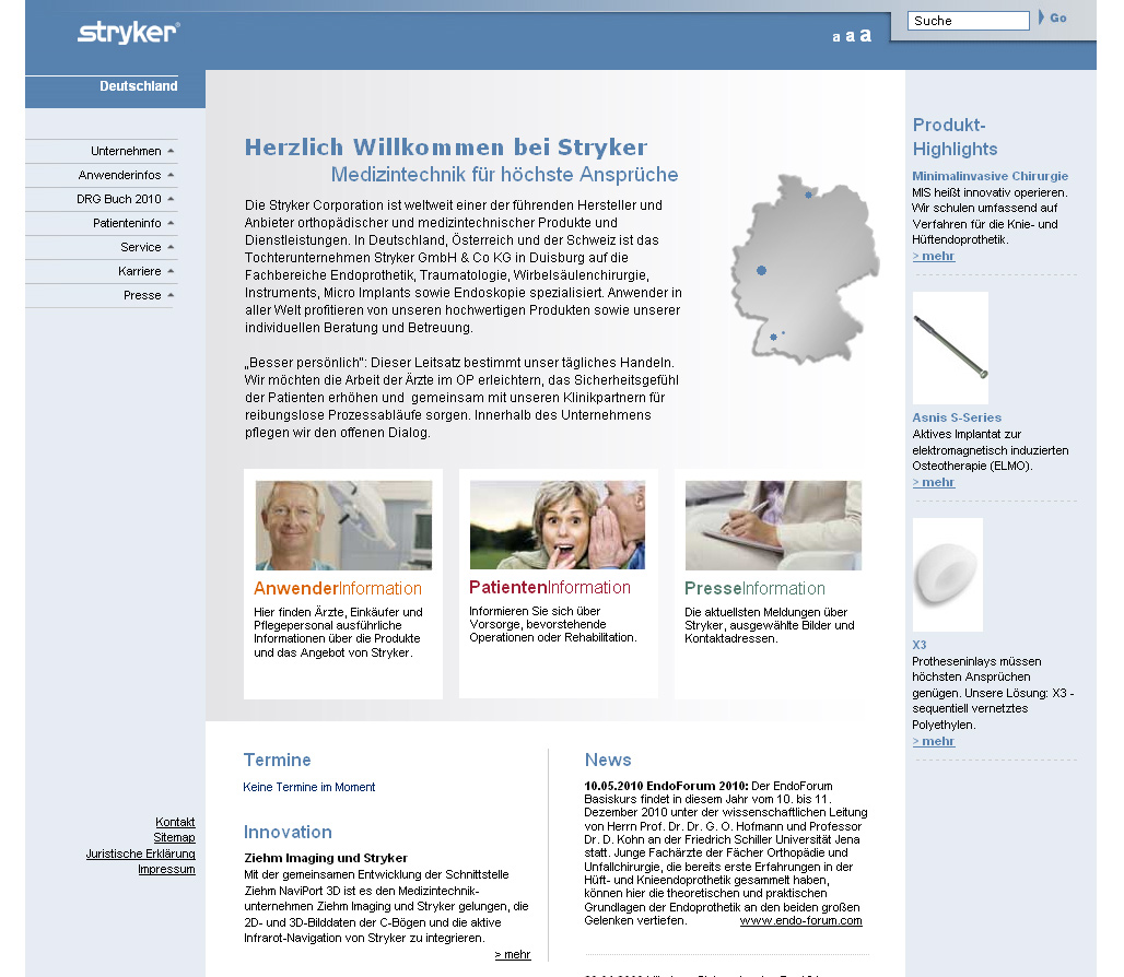 Die Stryker Corporation ist weltweit einer der führenden Hersteller und Anbieter orthopädischer und medizintechnischer Produkte und Dienstleistungen. In Deutschland, Österreich und der Schweiz ist das Tochterunternehmen Stryker GmbH & Co KG in Duisburg auf die Fachbereiche Endoprothetik, Traumatologie, Wirbelsäulenchirurgie, Instruments, Micro Implants sowie Endoskopie spezialisiert.