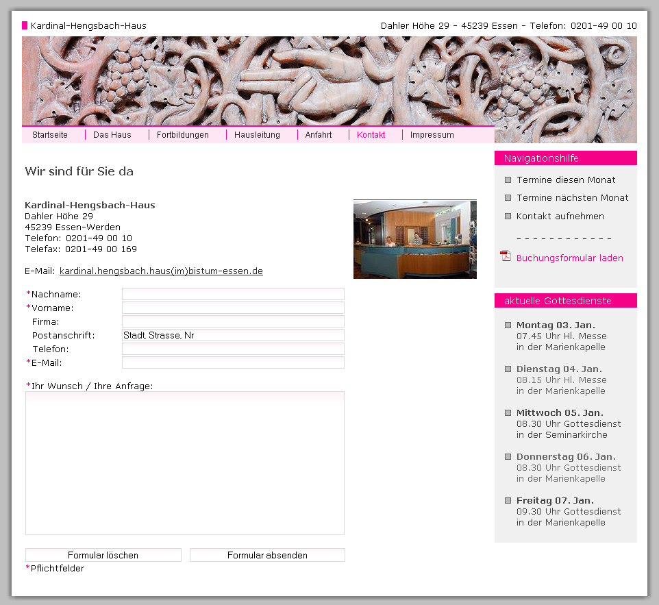 Das Kardinal-Hengsbach-Haus ist die Bischöfliche Tagungsstätte für Priesterfortbildung, Pastorale Bildung und Exerzitien im Bistum Essen. Es wurde eine komplett neue Internetseite aufgebaut, die über das Redaktionssystem der Webagentur Niewerth verwaltet und erweitert werden kann. Das Design sollte an das der Homepage des Bistums Essen angelehnt, aber eigenständig sein.