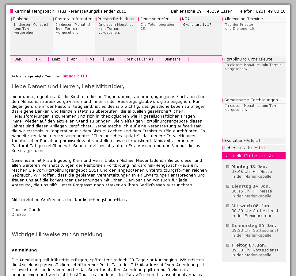 Teil des Auftrags war unter Anderem die Realisierung eines leicht pflegbaren Online-Veranstaltungskalenders, der dynamisch alle Termine der kommenden 12 Monate anzeigt, wobei die Monate automatisch per PHP